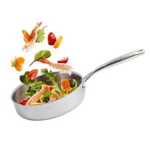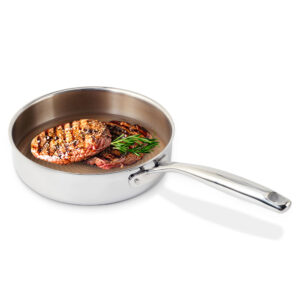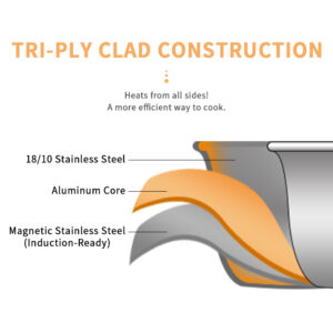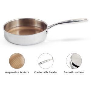 * Efficient, fast and even heat distribution lower the cooking temperature for most foods. You always use less oil when cooking eggs, sausages, fish, omelet and reduce the oil smoke with our stainless steel pan. It’s PFOA free.